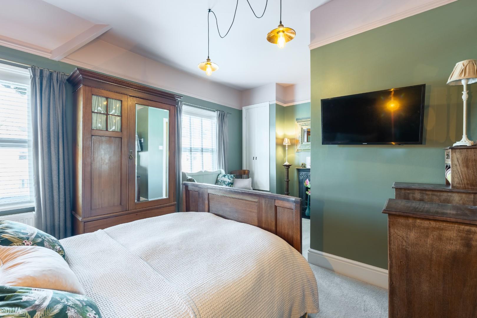 A spacious and beautifully appointed principal bedroom with twin double glazed windows to front elevation, central heating radiator, original cast iron fireplace, built-in wardrobe and door to:-