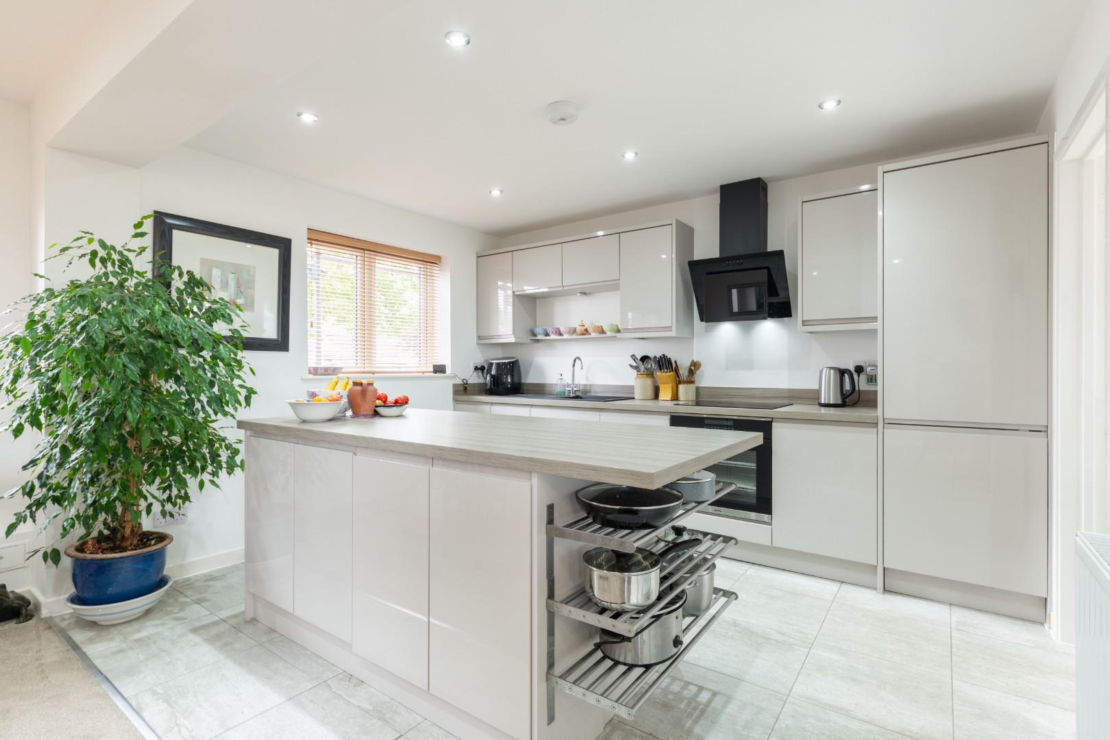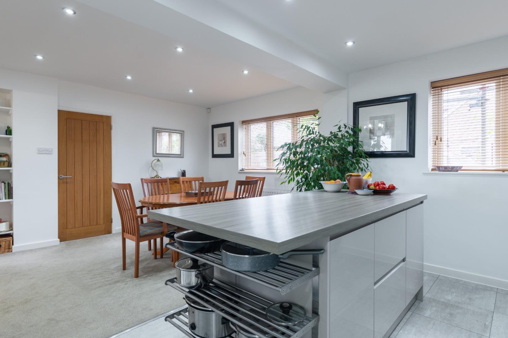 A spacious and stylish room with the kitchen being comprehensively equipped with a range of units in modern gloss finish and comprising ample base cupboards, drawers and storage solutions complemented by a range of coordinating wall cabinets to one side, wood grain effect worktops with matching upstands and matching large central island unit with further coordinating storage beneath, integrated appliances comprising inset induction hob with feature filter hood over and fitted electric oven below, integrated fridge freezer, together with stylish sink unit having pillar mixer tap, ceramic tiled flooring to the kitchen area with central heating radiator and ceiling downlighters through the kitchen and dining area, twin UPVC double glazed windows to front elevation and access to:-