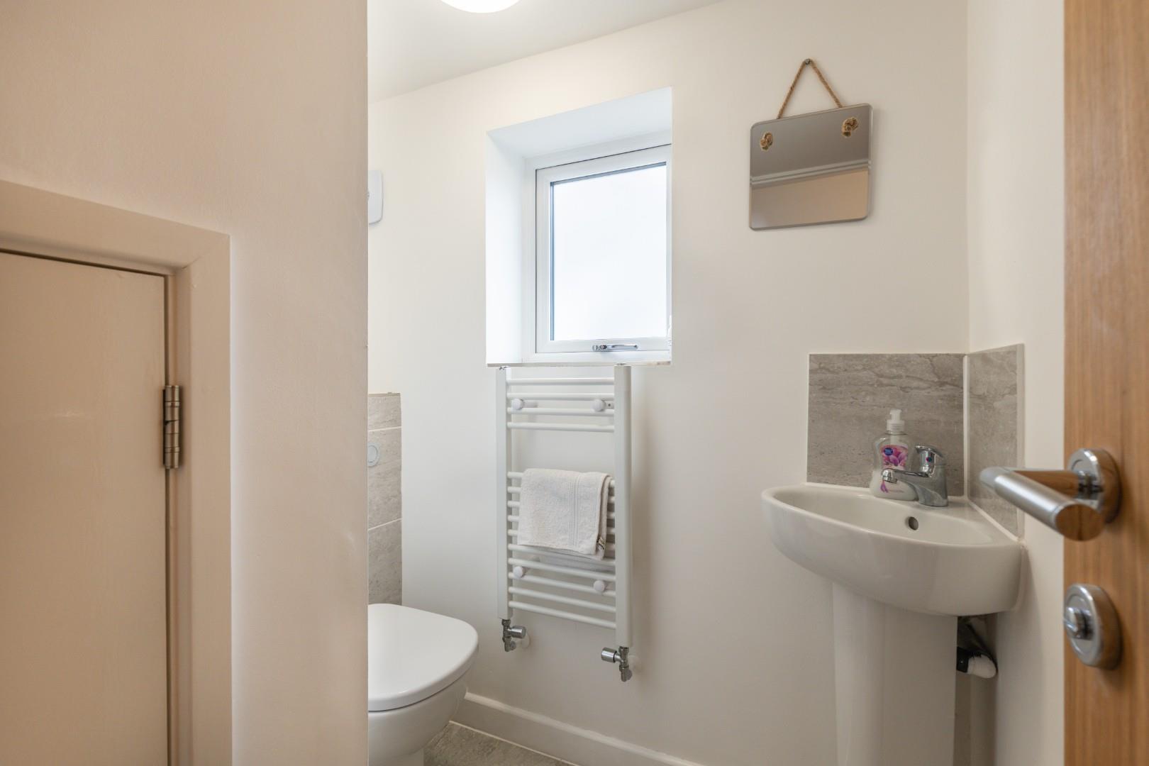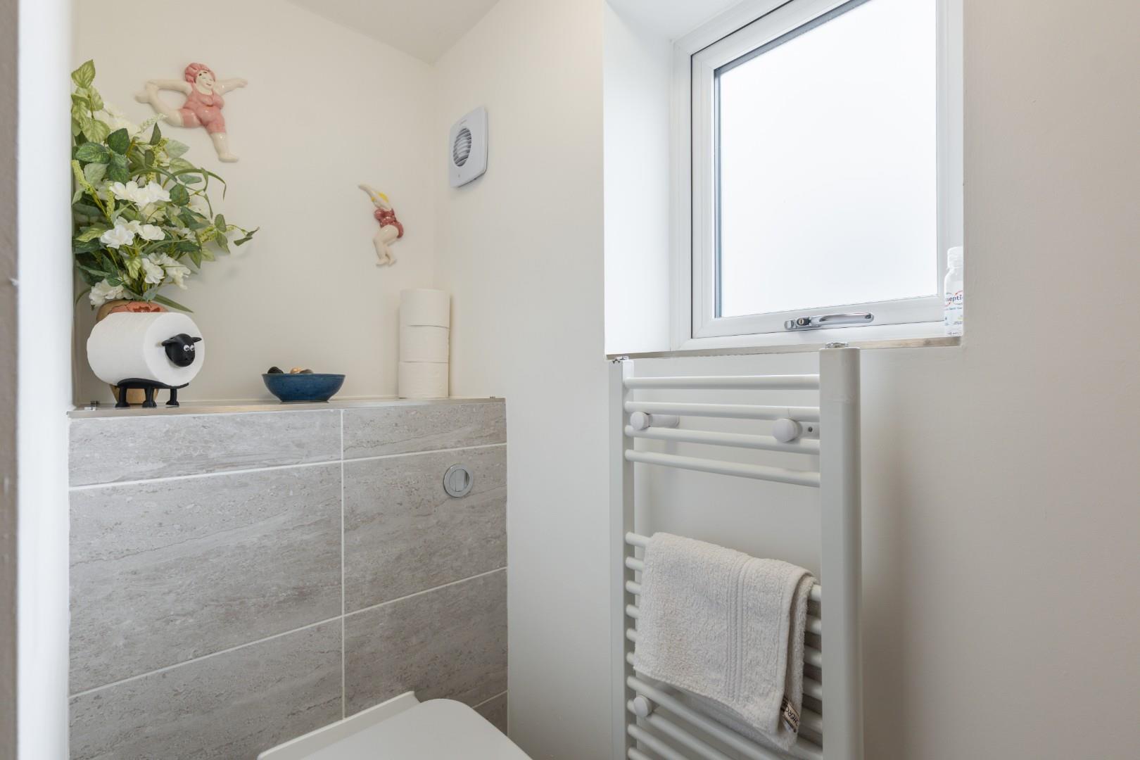 With contemporary white fittings comprising low level WC with concealed cistern, corner wash hand basin with mixer tap and tiled splashback, obscure UPVC double glazed window, towel warmer/radiator and door to understairs storage cupboard.