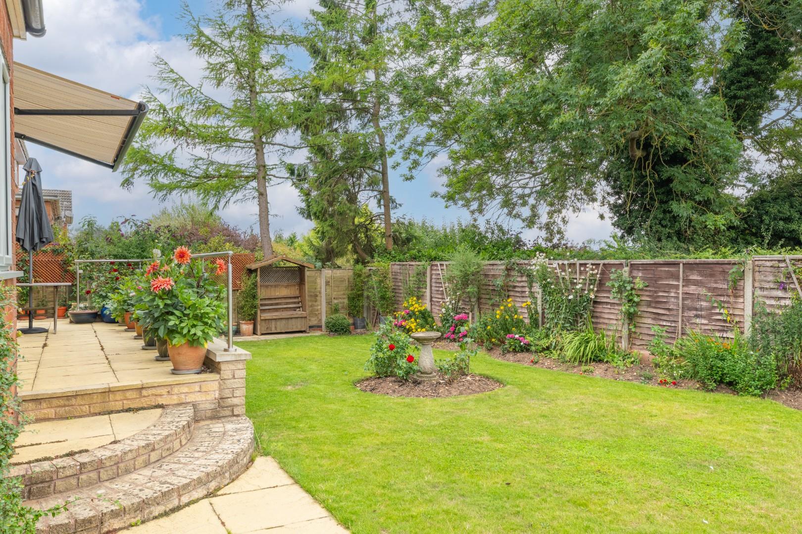 A beautifully laid out rear garden which wraps around the house to one side and features lawn with beautifully stocked, shaped borders complemented by a central circular bed. Immediately to the rear of the house is an elevated patio area flanked by a glazed balustrade, over which extends a fitted awning. The garden offers an excellent degree of privacy, not being directly overlooked from the rear and offering far-reaching views.