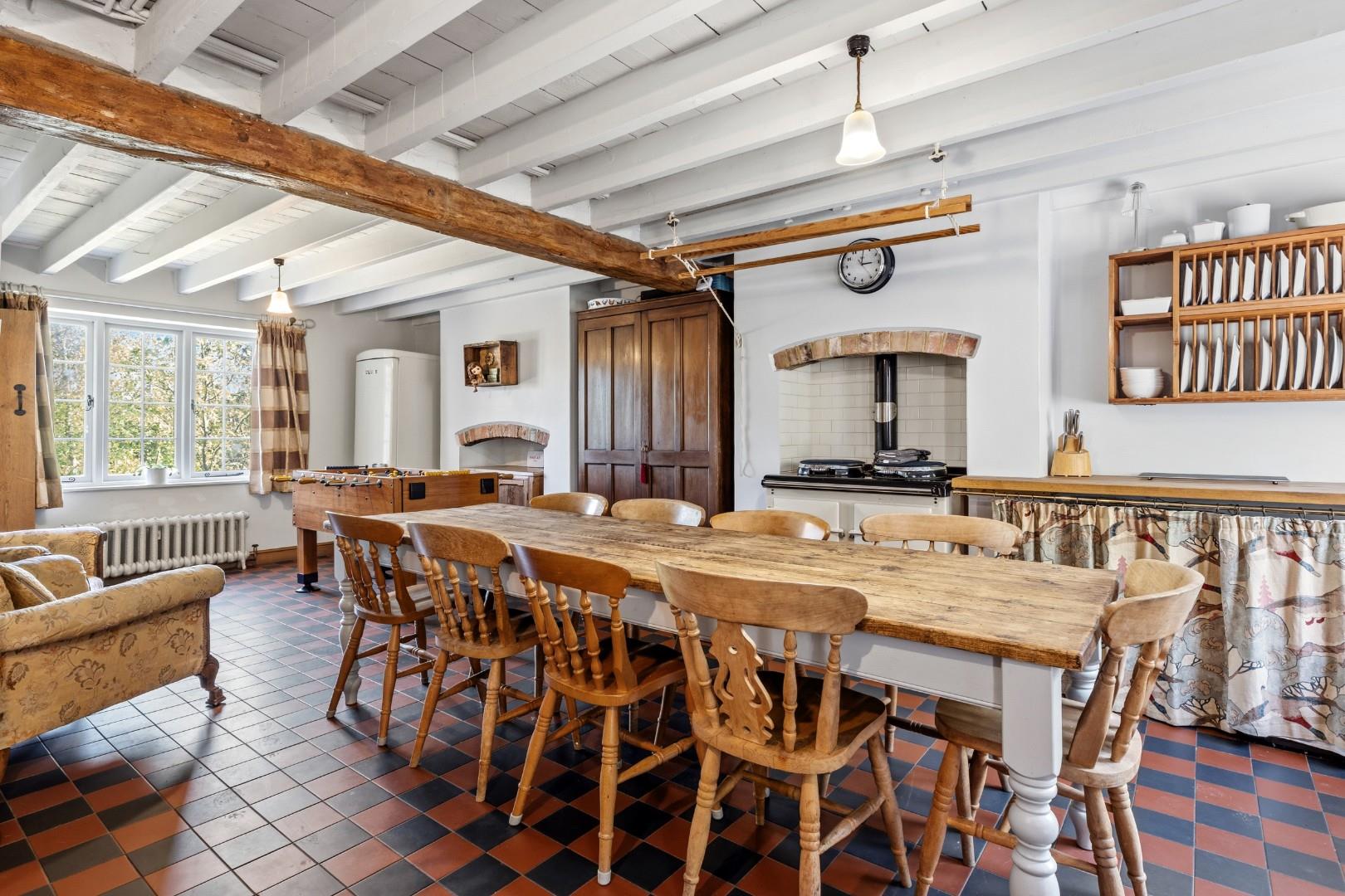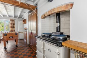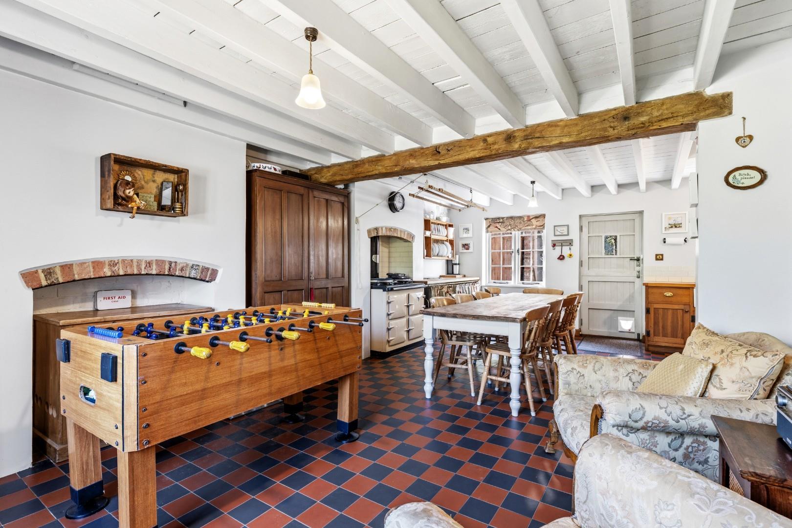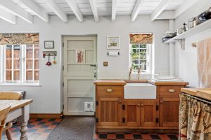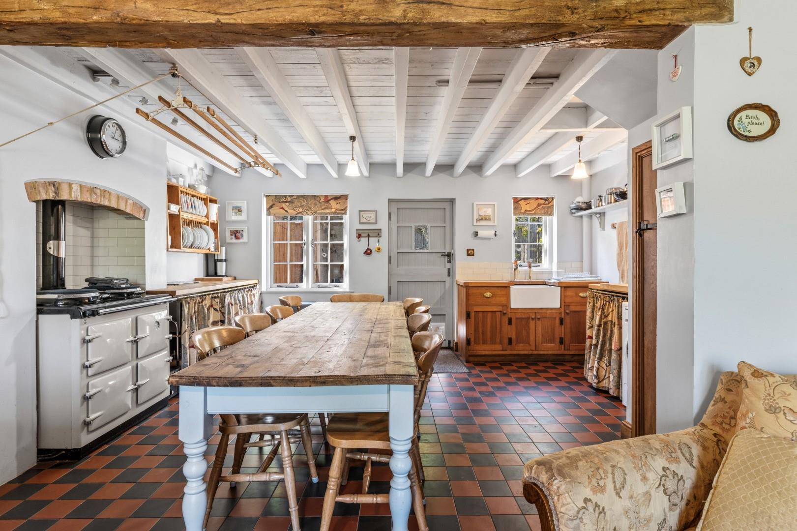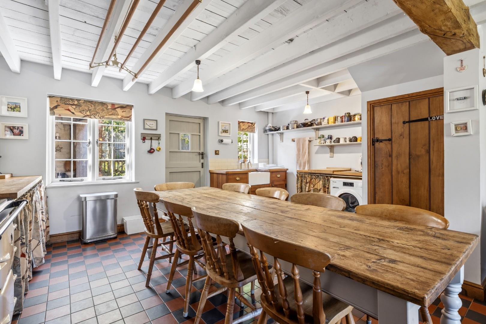 Forming a delightful kitchen, dining and social space. The kitchen area being equipped with handmade units comprising undermounted Belfast sink with solid wood worktops/drainer, cupboards and drawers below and surface mounted brass taps, worktop with space and plumbing below for automatic washing machine and one further appliance, Heritage oil fired stove/range with twin hotplates, twin ovens and also powering the oil fired central heating system, quarry tiled flooring throughout the kitchen, dining and family areas, door to shelved understairs storage cupboard/pantry, handmade windows to front and rear together with cast iron Victorian style radiator, television aerial connection, exposed ceiling timbers and stable door giving access to the rear garden.