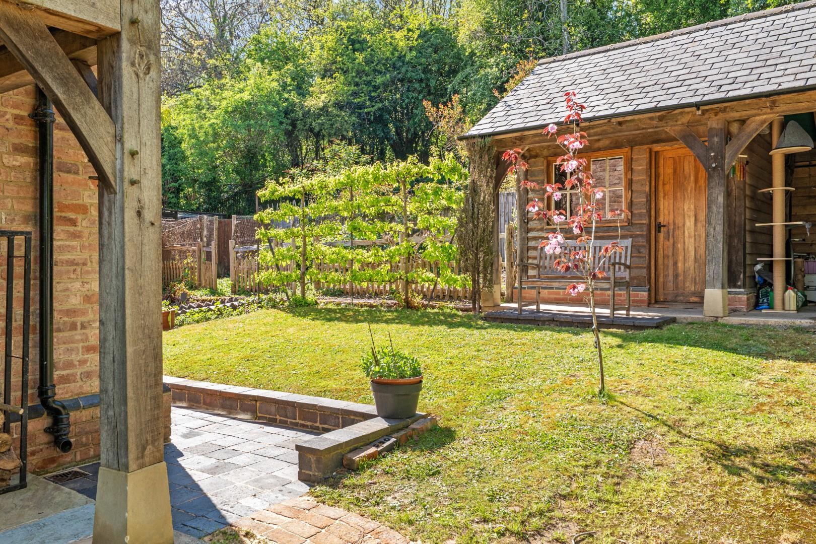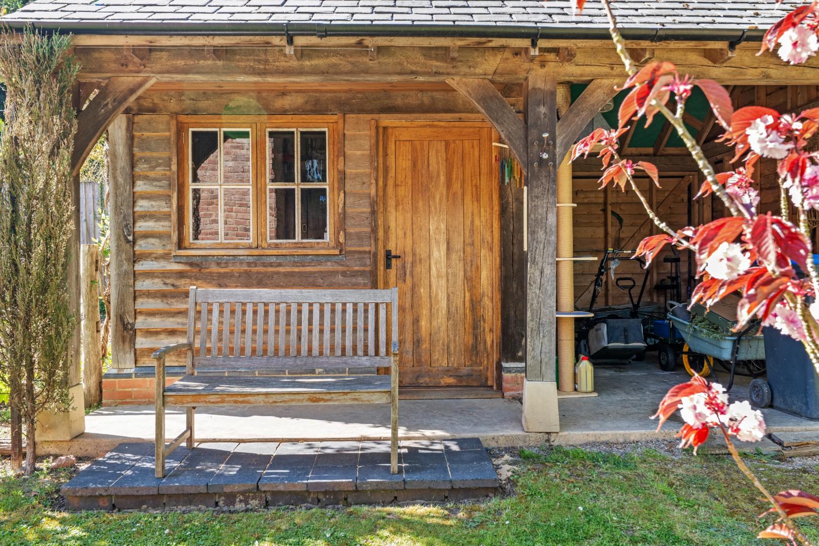 Again being thoughtfully constructed, principally in oak, with slate roof and providing covered parking space for one vehicle alongside of which is a separate and highly useful workshop having electric light and power and window to front. Useful overhead mezzanine storage area. Access can be gained from the driveway and side terrace to:-