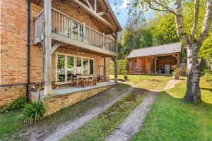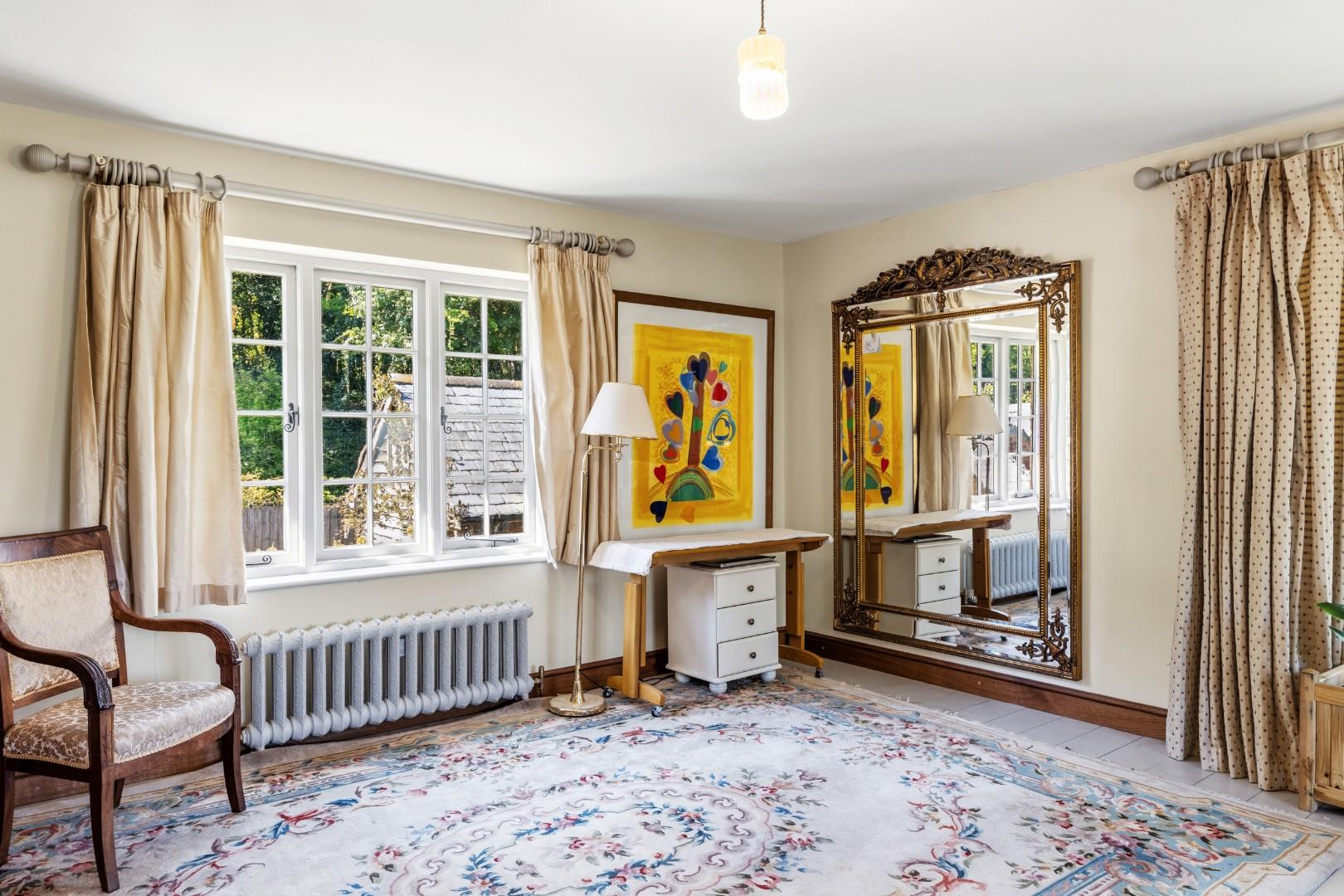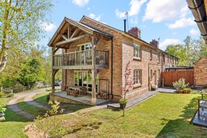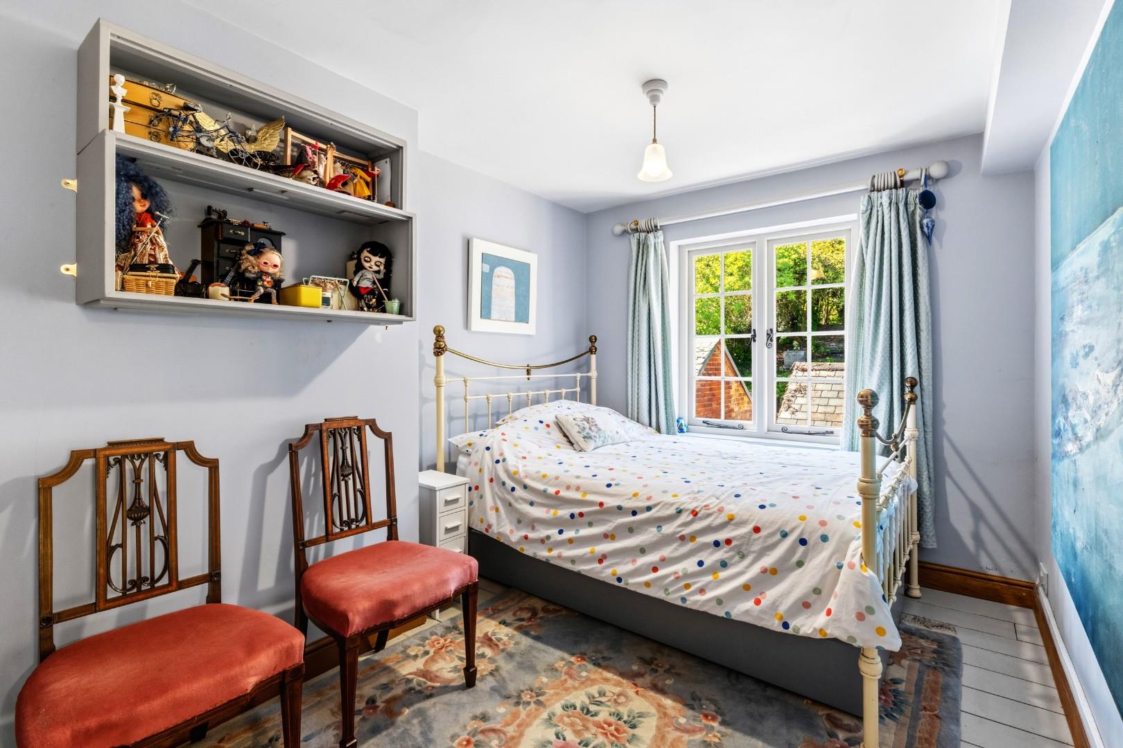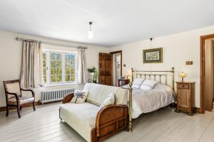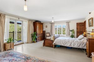 Which could potentially be split to form two separate bedrooms with the master bedroom vertically replicating the sitting room below and being a superbly spacious room with lovely views from the front of the cottage towards the private woodland and River Itchin, exposed painted floor timbers, handmade windows to front and rear elevations, cast iron Victorian style radiators to either end of the room, reproduction light fittings, bespoke double doors opening onto the balcony and further oak door to:-