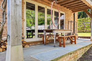 Being constructed in brick with quarry tiled floor, timber door fronting and high flush WC.