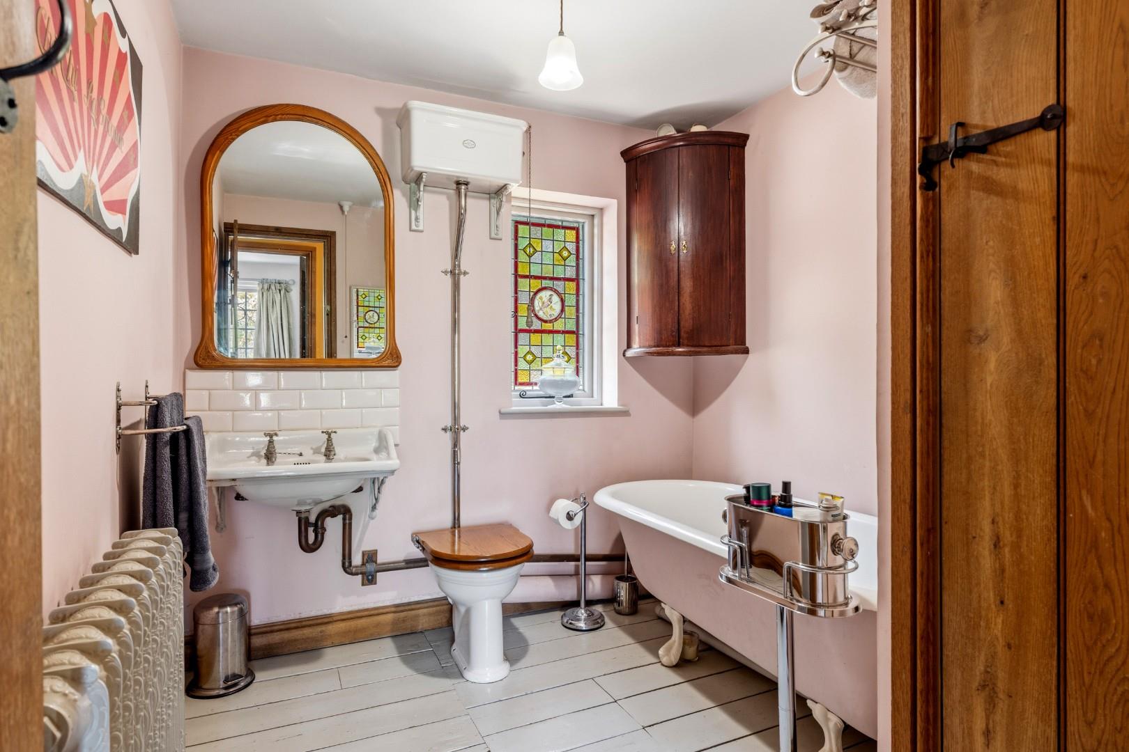 Being beautifully appointed following the period theme from the rest of the cottage and having Victorian roll-top bath with mixer tap and shower attachment, Victorian wall mounted wash hand basin with tiled splashback, high flush WC by Thomas Crapper and Company, lovely stained glass leaded window, exposed painted floor timbers, cast iron Victorian style radiator and oak door to airing cupboard housing the pressurised hot water system.