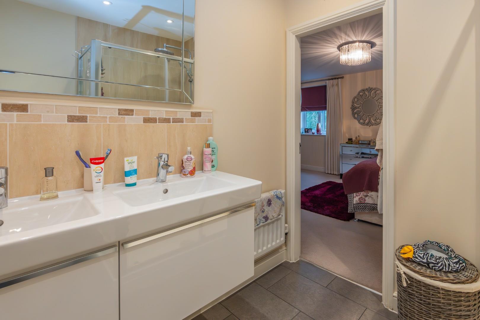 Finished to an exceptional standard and comprising a three piece Villeroy & Boch suite with low level WC with dual flush, vanity unit mounted wash hand basin with his / hers sinks with under counter storage. There is a large double shower cubicle with dual headed shower and sliding glass screen. Having tiling to all splash back areas and flooring and spot lighting, ceiling mounted extractor fan, wall mounted vanity mirror and shaver point and heated towel rail.