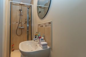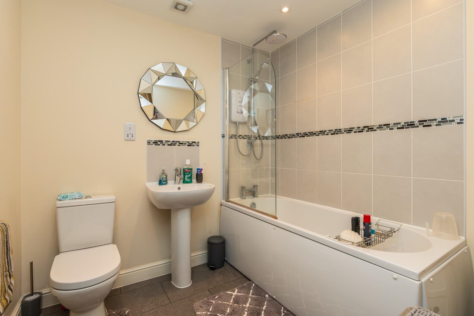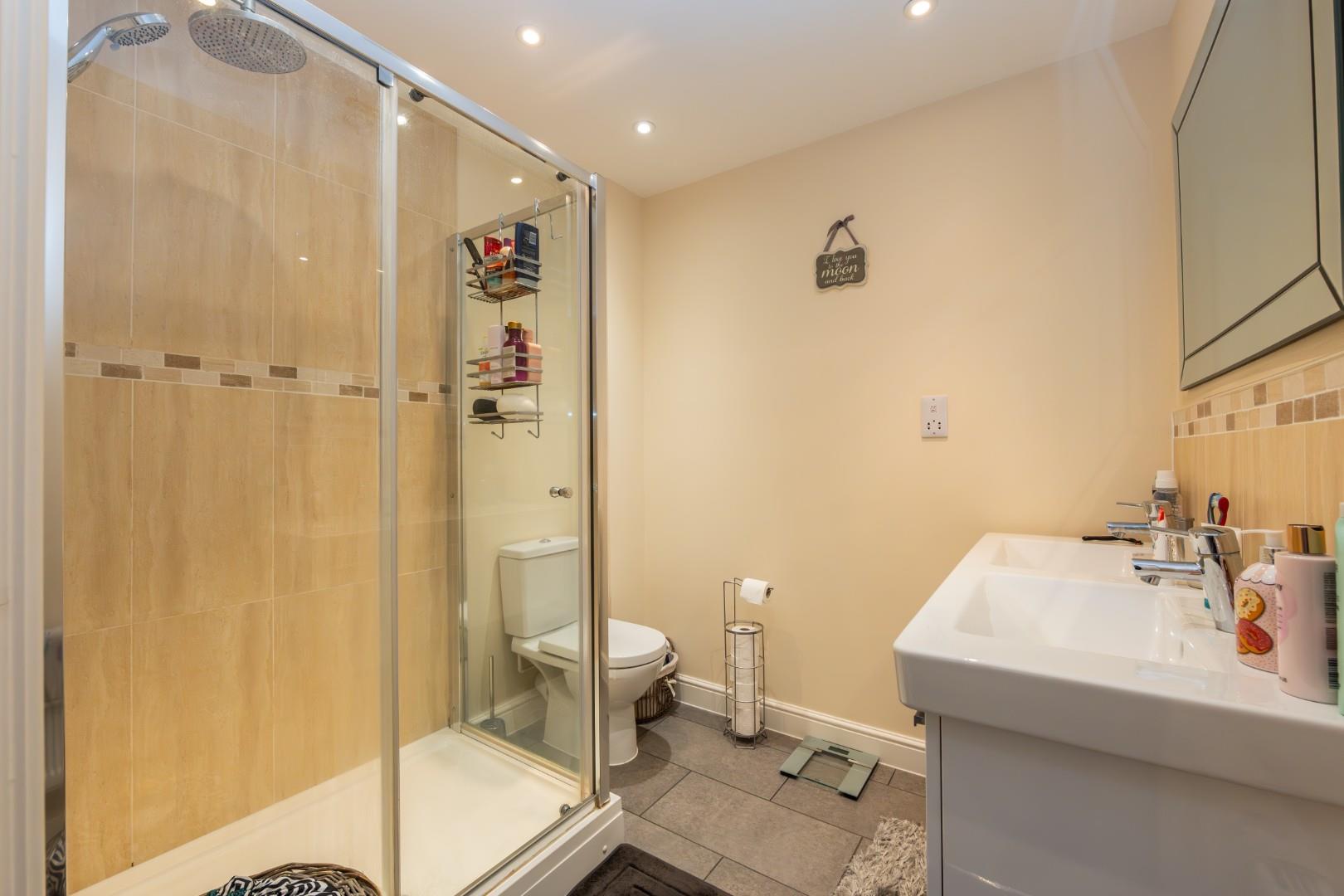 With a modern suite, vinyl flooring, having shower, wash hand basin and low level flush wc, central heating radiator and spot lighting.