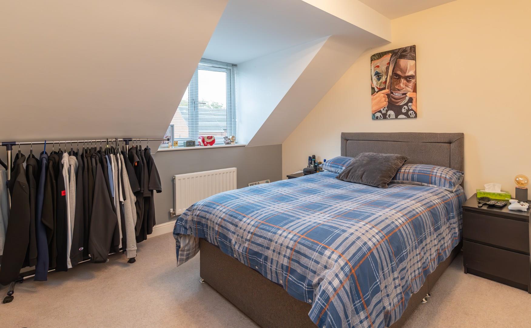 A further large double bedroom located to the rear of the property, dormer window with views to the front, velux style roof window and fitted wardrobes.