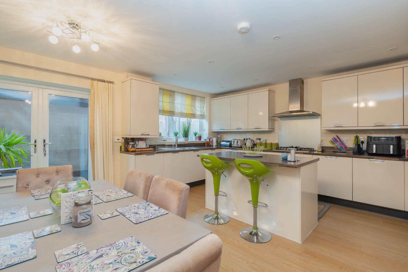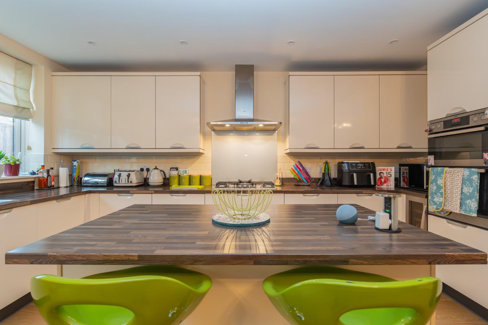 This large, open and sociable reception room is beautifully presented with a modern glossy range of wall and base units offering lots of storage. Complementary works tops are supplied having tiled splash backs and a large central island offers further preparation space and seating. There is a selection of white goods integrated including an oven, a hob, an extractor, a fridge / freezer, dish washer, washer drier and wine cooler. The flooring seamlessly continues from the entrance hallway and doors lead you out to the landscaped garden.
