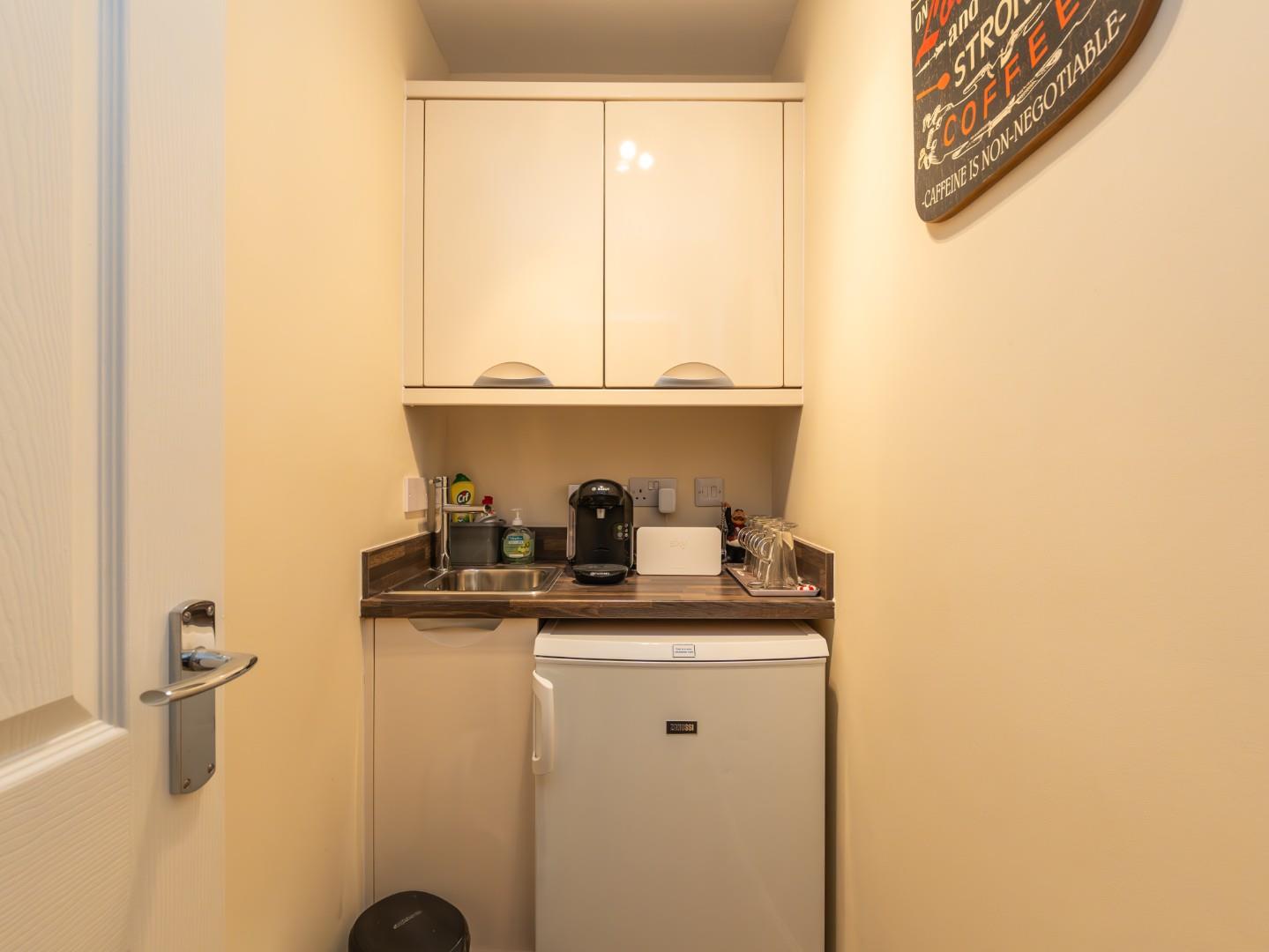 This incredibly useful kitchenette space is accessed from the first floor landing and provides space for under counter fridge and offers further storage to that of the kitchen with a selection of wall and base mounted units with contrasting work surfaces over, an inset stainless steel sink.