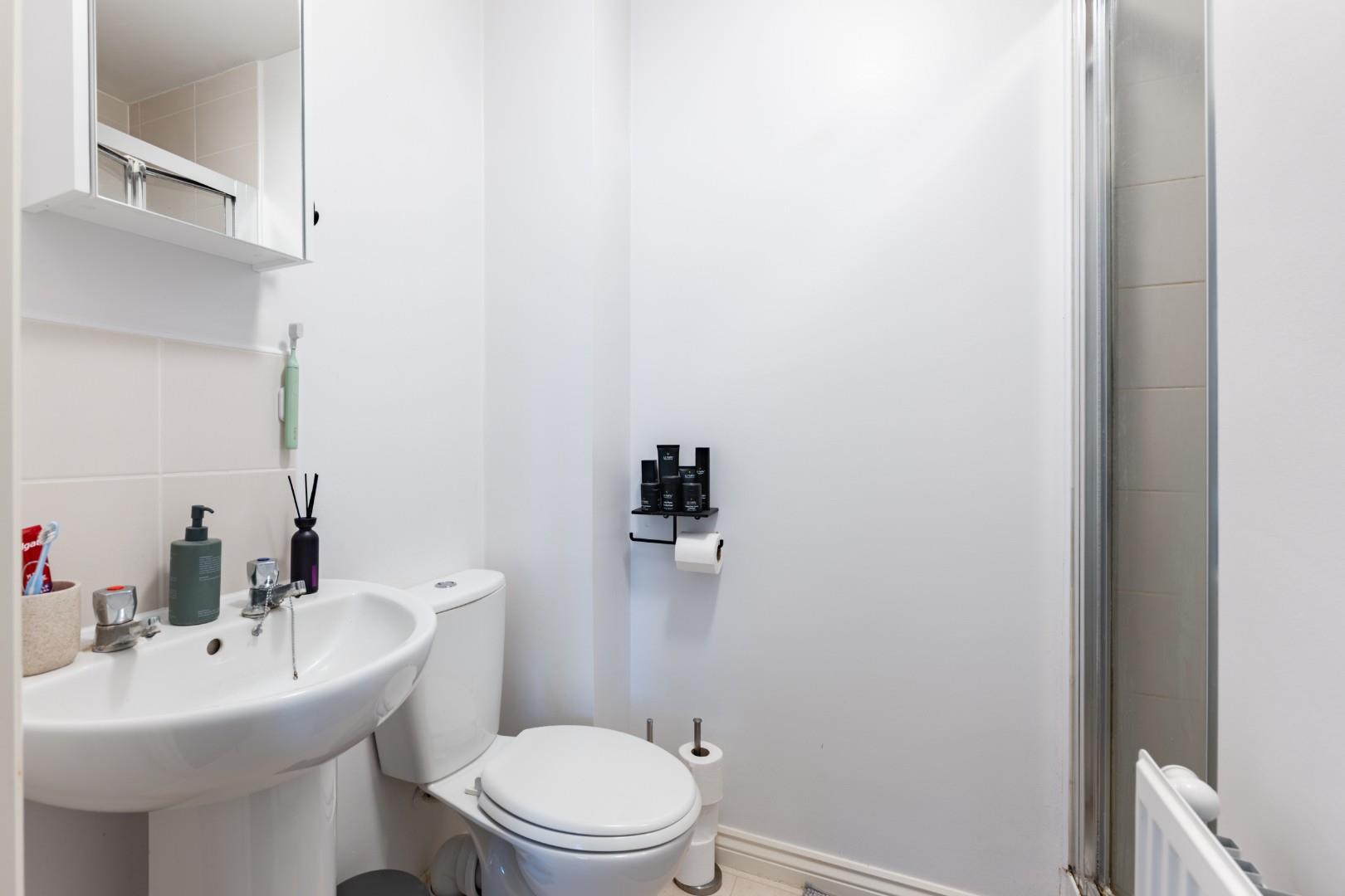 Having a white suite comprising WC, pedestal wash hand basin with tiled splashbacks, gas central heating radiator and a double glazed window to the front aspect.