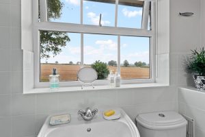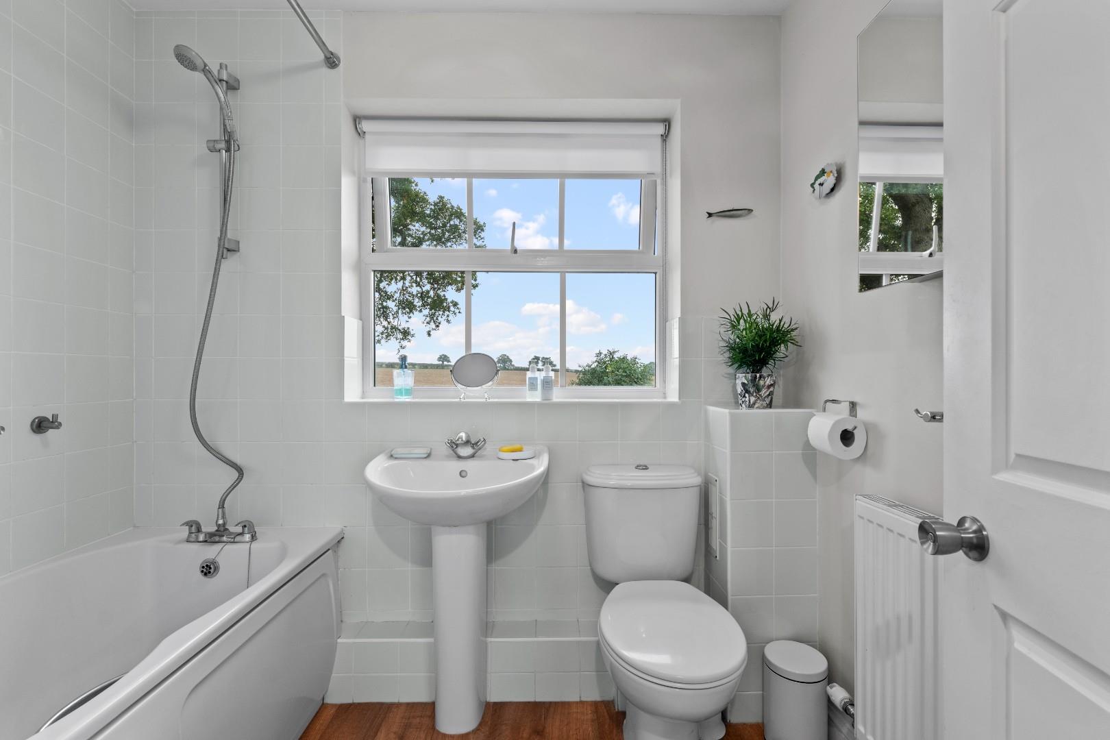 With partly ceramic tiled walls and white fittings comprising low level WC, pedestal wash hand basin with mixer tap, panelled bath with mixer tap and shower attachment, UPVC double glazed window which takes advantage of the views from the rear and central heating radiator.