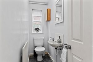 With white fittings comprising low level WC, wall mounted wash hand basin with tiled splashback, obscure UPVC double glazed window and central heating radiator.
