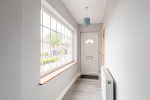 This large and bright entrance hallway is part of the garage conversion with fresh decor and offering tiled flooring, stairs rising to the first floor with storage cupboard and doors leading off to a multitude of rooms.